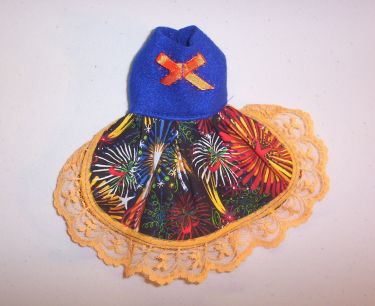 All of my items are my own design and pattern. This one is a cute little FIREWORKS! Print Dress with BLUE fleece top with Orange Lace and Little Bow.
