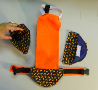 This Goose Diaper Holder Harness is made with Cute Candy Corn Halloween Day Print, backed with a waterproof fabric and it is oh so cute. It has a small ring for a light weight leash with a small hook. This Goose Diaper Holder can be lined with a sanitary napkin, a human baby diaper, a folded newspaper page or other folded papers.