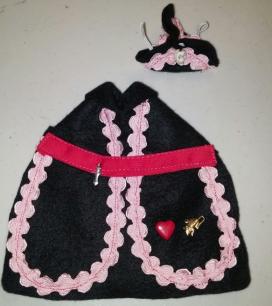 This little costume is adorable with a a Red Heart Button and Gold Rat Charm on the hip, a Skull Bead on the Matching Captain's Hat, a Silver colored Dagger Charm on the Red Belt. There is a lot of hand work in this outfit!