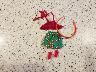 With this lot you will receive what you see in the photo. The cute little Candy Cane Print Skirt, the Red Crocheted Halter Top the Light Middie size Pair of Shoes (that click on from the little toe over and STAY on the foot!) as well as the matching Headband.