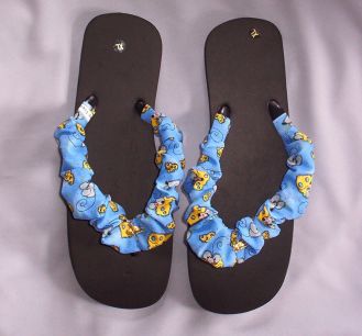 These rubber Flip Flop shoes are covered on each strap with rattie & cheese print fabric, with a gold toned rat charms. This pair is black and is aprrox. 11 1/4" long and approx. 4" wide at the widest part (ball of the foot). The shoe manufacturer has the size XL on this pair.