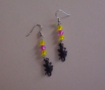 These adorable little silver toned pieced earrings are just the cutest, little earrings with three "ice" beads each. They were made by me with silver toned fish hook type pieced earrings. The earrings have two yellow and one purple ice type beads hanging above each of the ratties. We do not have a great camera and had a heck of a time getting a photo. But, boy, these are cute earrings!!
