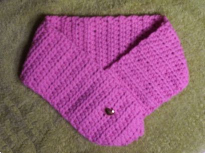 The scarf has been hand crocheted stitch by stitch. It is approx. 29" long and is about 4 1/2" wide. It has a large Heart Shaped button to not only keep it on your neck but also make it very adjustable for all size necks.