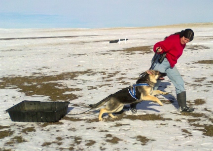 | german shepherd sled dog beginning learning to pull drag harness |